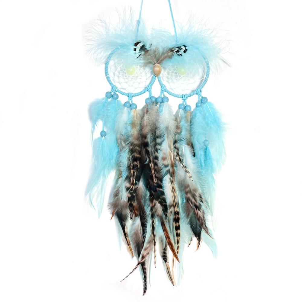 Caça-sonhos artesanal com mocho (coruja) azul. A coruja é símbolo de sabedoria, proteção espiritual e visão além das aparências. Este caça-sonhos ajuda a afastar más energias e sonhos negativos, trazendo serenidade e equilíbrio ao ambiente.